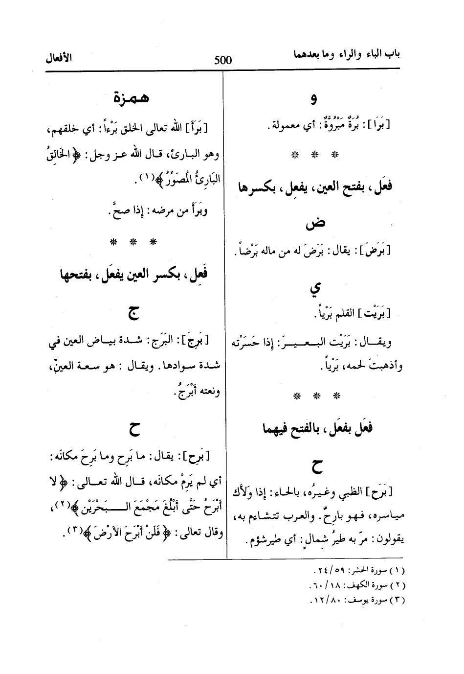[بَرَأَ] اللّاه تعالى الخلق بَرْءاً: أي خلقهم، وهو البارئ، قال اللّاه عز وجل: الْخاالِقُ الْباارِئُ الْمُصَوِّرُ «1».
