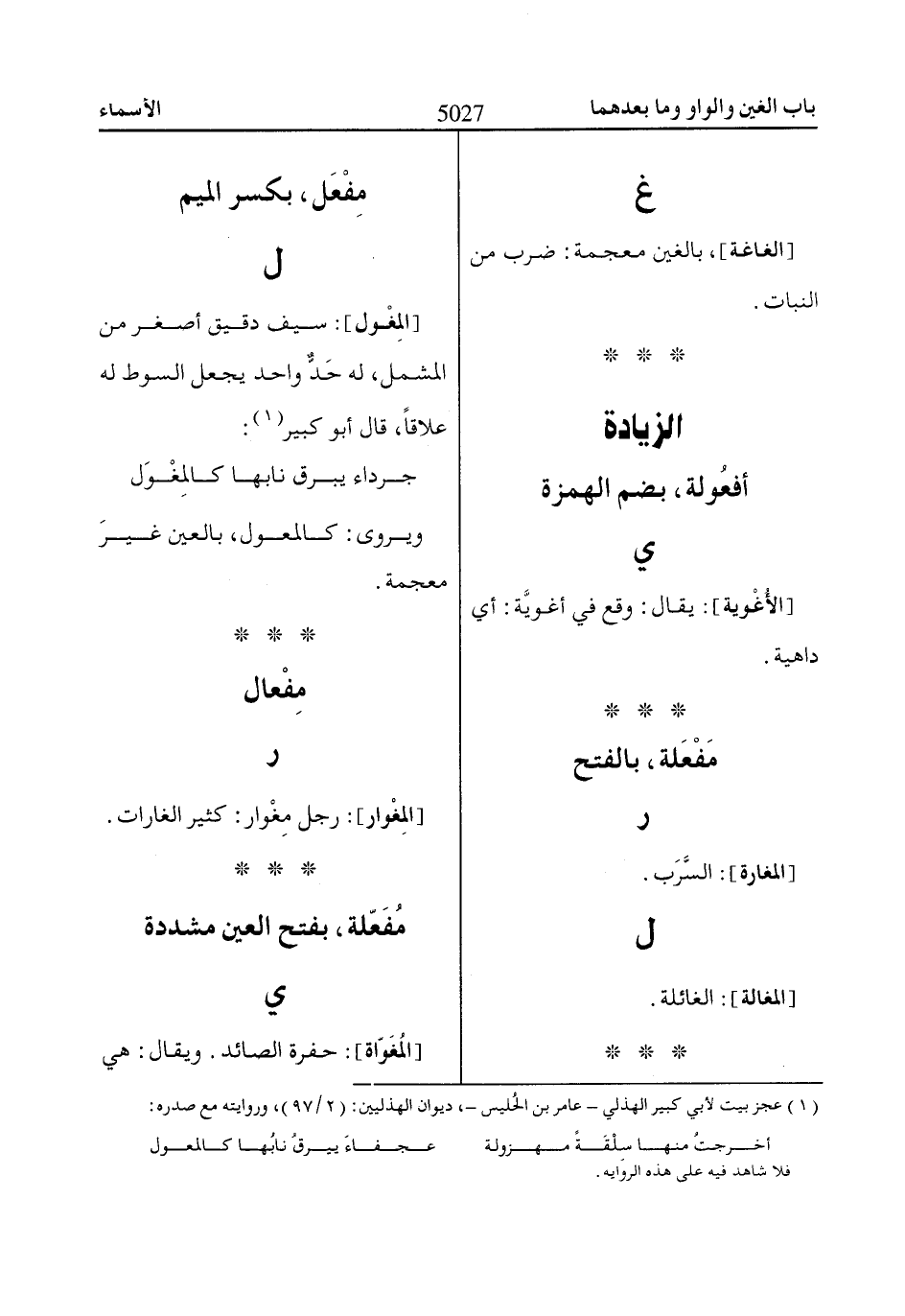 [المِغْول]: سيف دقيق أصغر من المشمل، له حَدٌّ واحد يجعل السوط له علاقا، قال أبو كبير «1»: