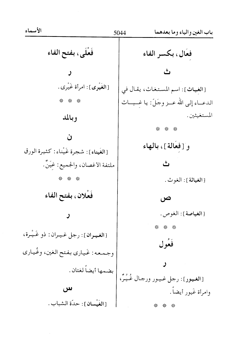[الغَيناء]: شجرة غَيْناء: كثيرة الورق ملتفة الأغصان، والجميع: غِيَنٌ.