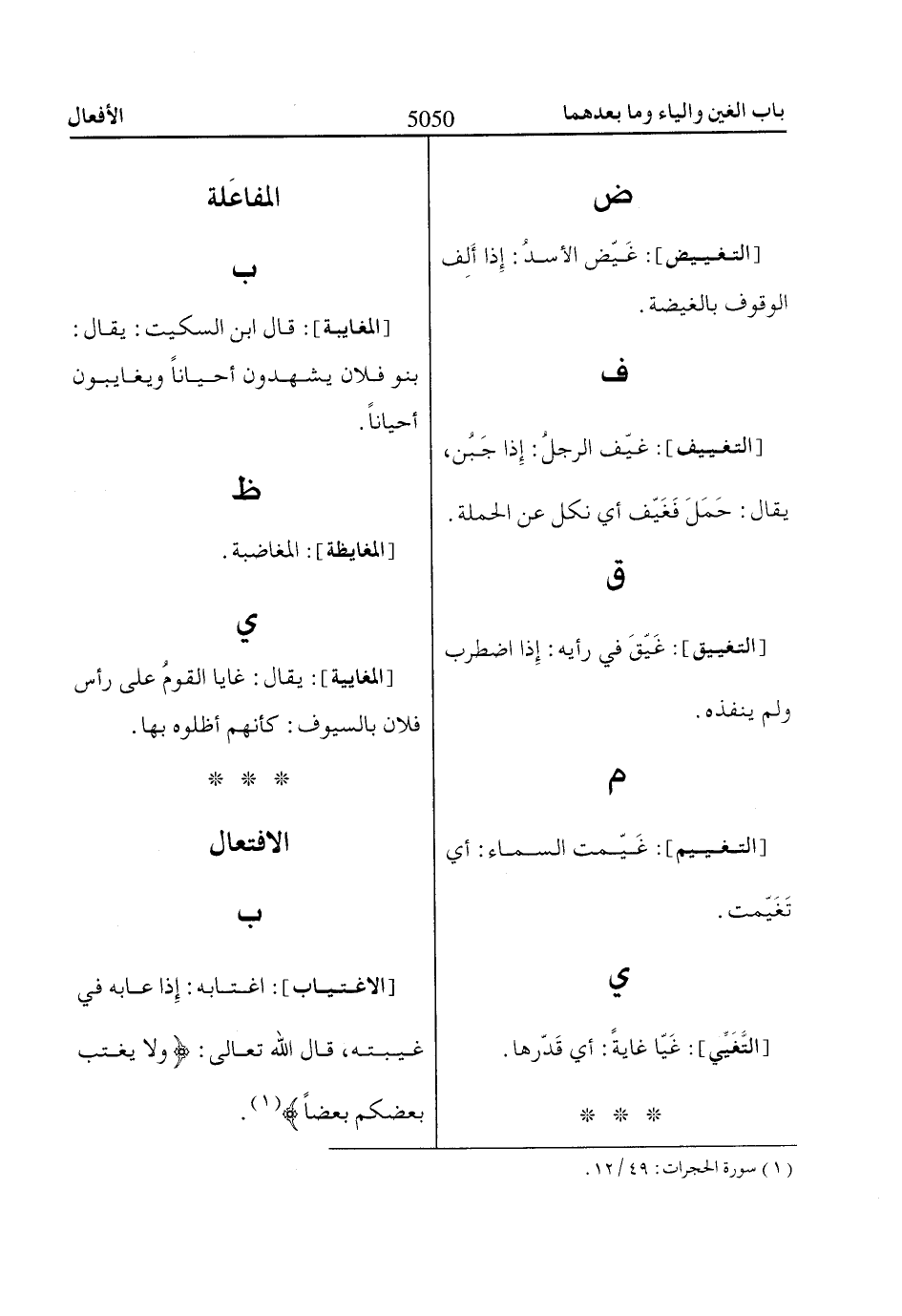 [الاغتياب]: اغتابه: إذا عابه في غيبته، قال اللّاه تعالى: وَلاا يَغْتَبْ بَعْضُكُمْ بَعْضاً «1».