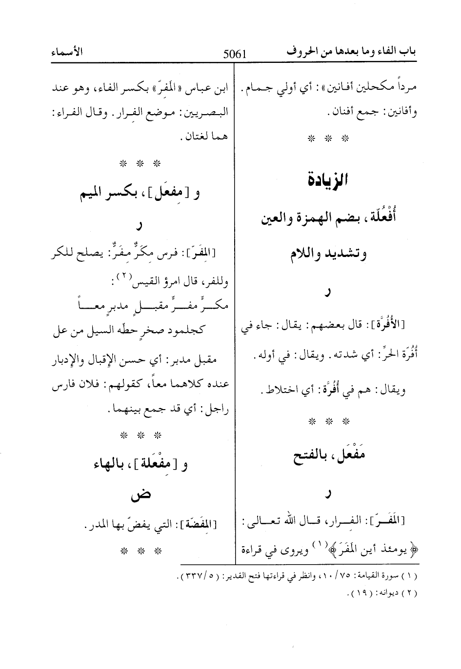 يَوْمَئِذٍ أَيْنَ الْمَفَرُّ «1» ويروى في قراءة ابن عباس «المَفِرّ» بكسر الفاء، وهو عند البصريين: موضع الفِرار. وقال الفراء: