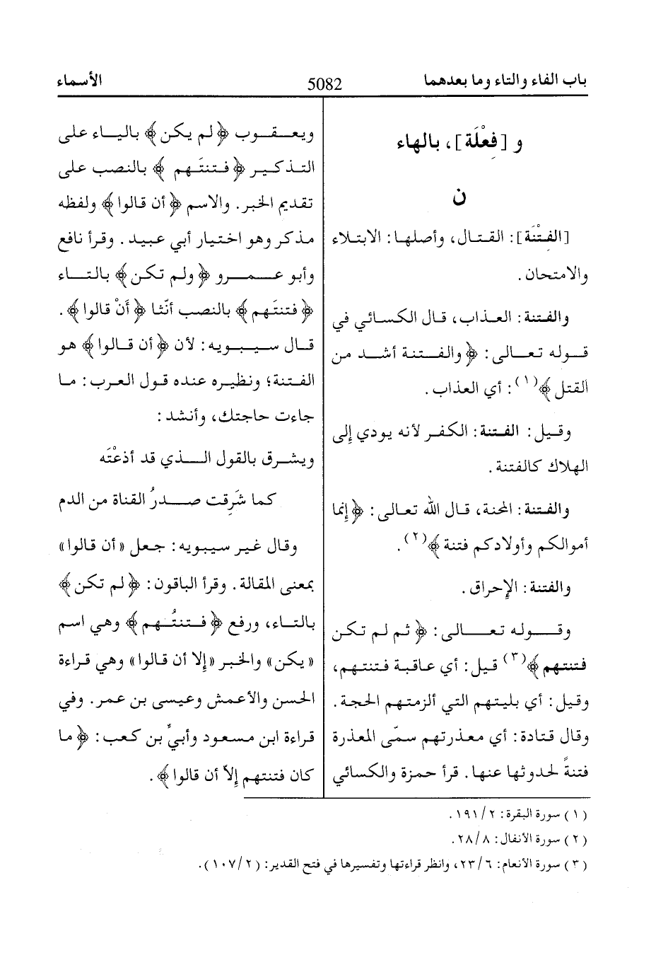 والفتنة: العذاب، قال الكسائي في قوله تعالى: وَالْفِتْنَةُ أَشَدُّ مِنَ الْقَتْلِ «1»: أي العذاب.