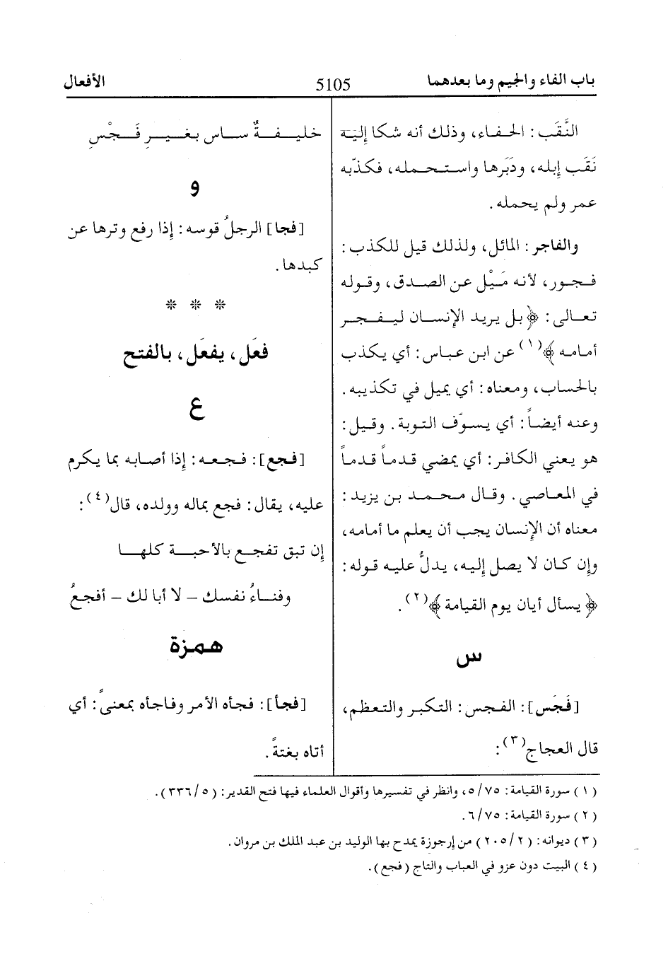 فجور، لأنه مَيْل عن الصدق، وقوله تعالى: بَلْ يُرِيدُ الْإِنْساانُ لِيَفْجُرَ أَماامَهُ «1»