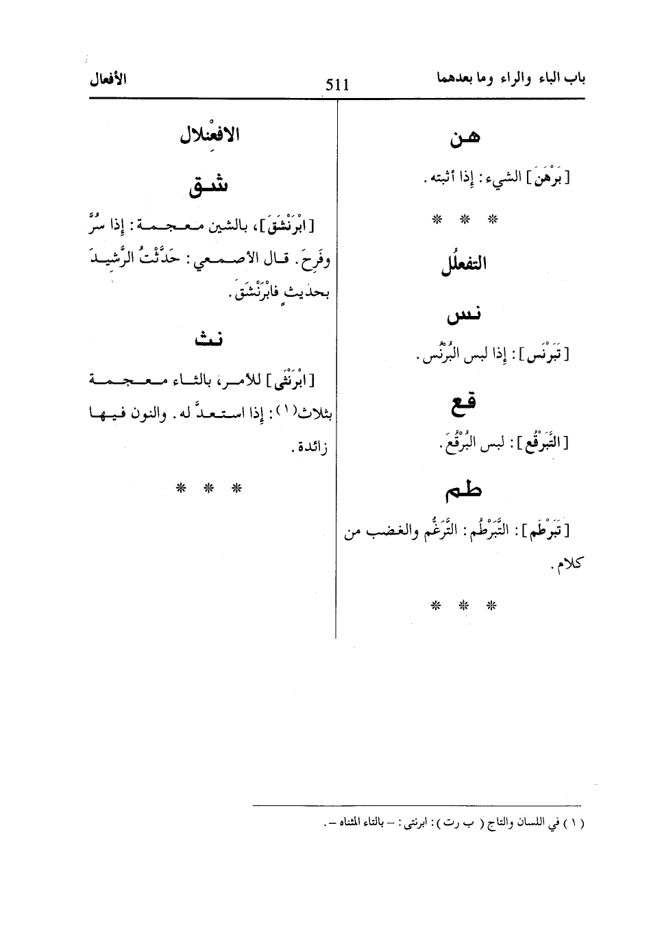 [ابْرَنْثَى] للأمر، بالثاء معجمة بثلاث «1»: إِذا استعدَّ له. والنون فيها زائدة.