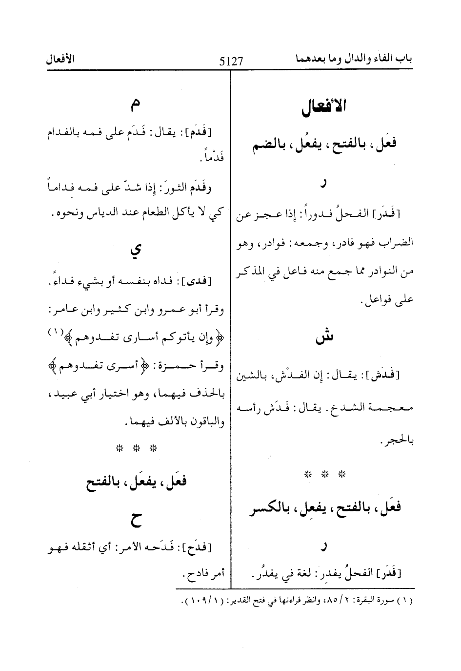 [فَدَر] الفحلُ فدورا: إذا عجز عن الضراب فهو فادر، وجمعه: فوادر، وهو من النوادر مما جمع منه فاعل في المذكر على فواعل.