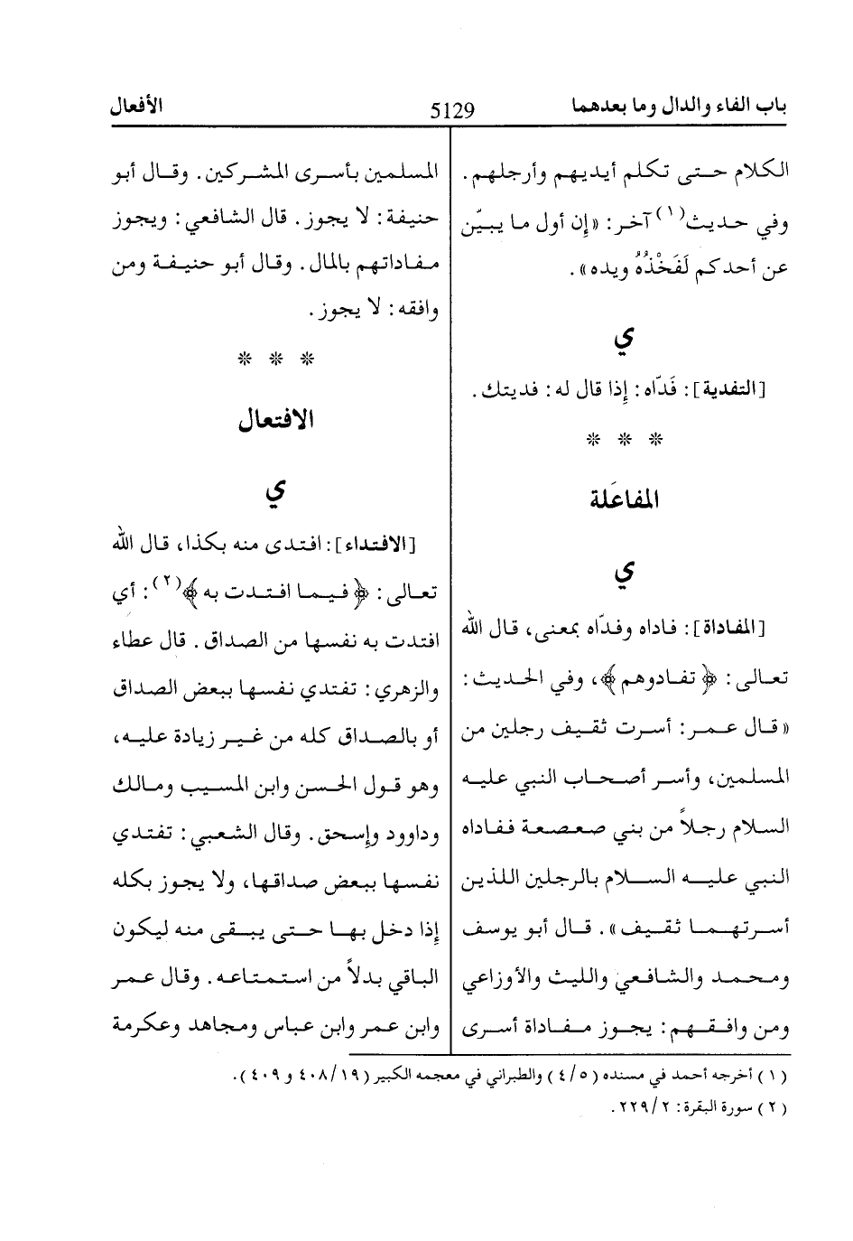 [الافتداء]: افتدى منه بكذا، قال اللّاه تعالى: فِيمَا افْتَدَتْ بِهِ «2»: أي افتدت به نفسها من الصداق. قال عطاء والزهري: تفتدي نفسها ببعض الصداق أو بالصداق كله من غير زيادة عليه، وهو قول الحسن وابن المسيب ومالك وداوود وإسحق. وقال الشعبي: تفتدي نفسها ببعض صداقها، ولا يجوز بكله إذا دخل بها حتى يبقى منه ليكون الباقي بدلًا من استمتاعه.