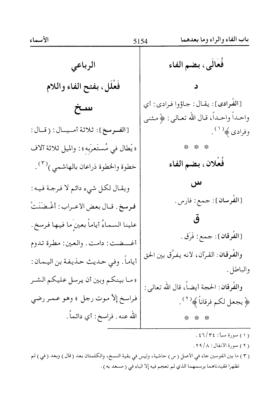 [الفُرادى]: يقال: جاؤوا فرادى: أي واحدا واحدا، قال اللّاه تعالى: مَثْنى وَفُراادى «1».