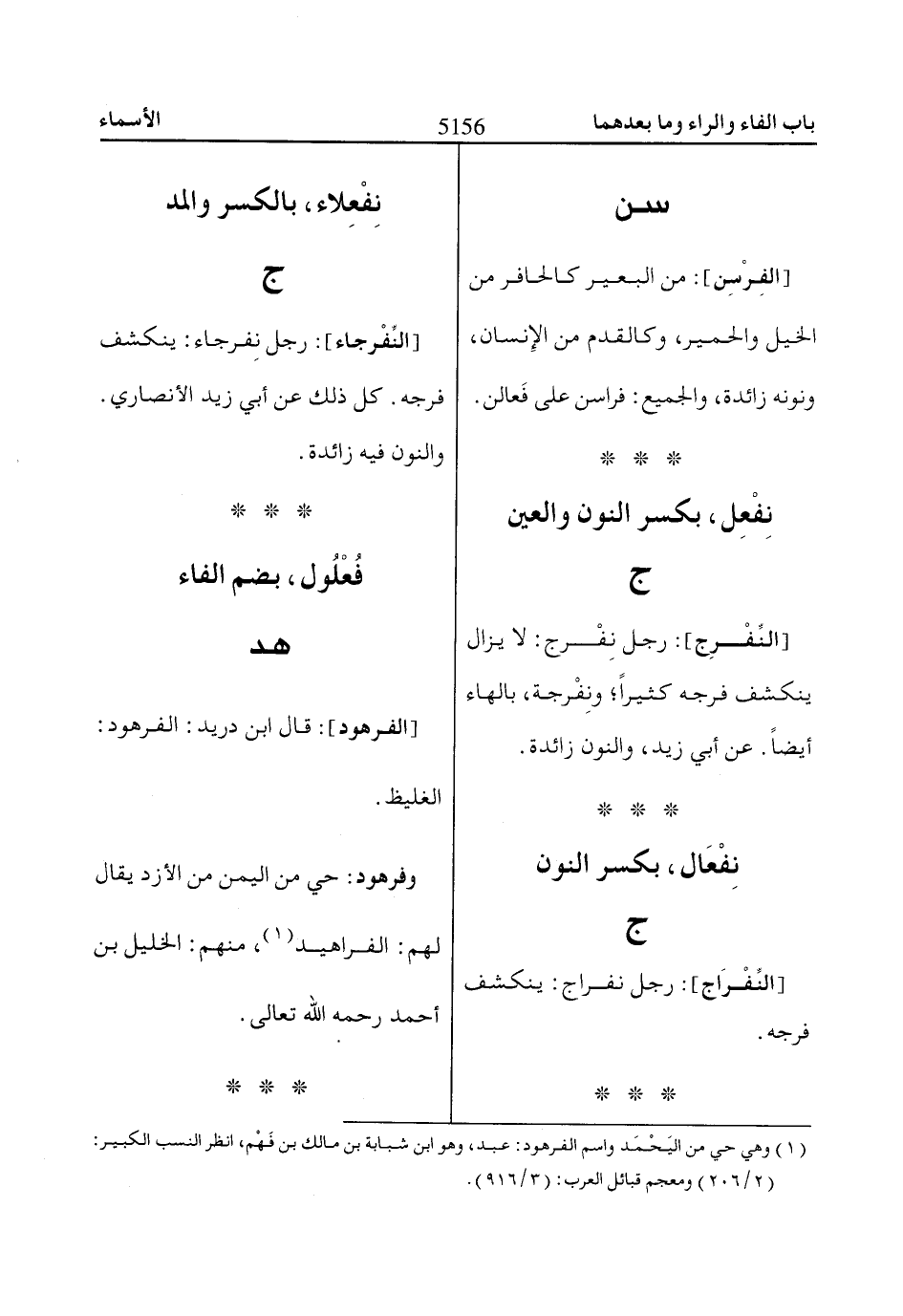[الفِرْسِن]: من البعير كالحافر من الخيل والحمير، وكالقدم من الإنسان، ونونه زائدة، والجميع: فراسن على فَعالن.
