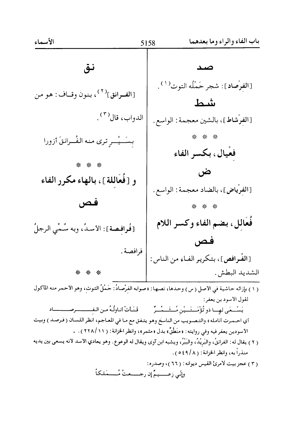 (1) بإزائه حاشية في الأصل (س) وحدها، نصها: «صوابه الفِرْصادُ: حَمْلُ التوتِ، وهو الأحمر منه المأكول لقول الأسود بن يعفر: