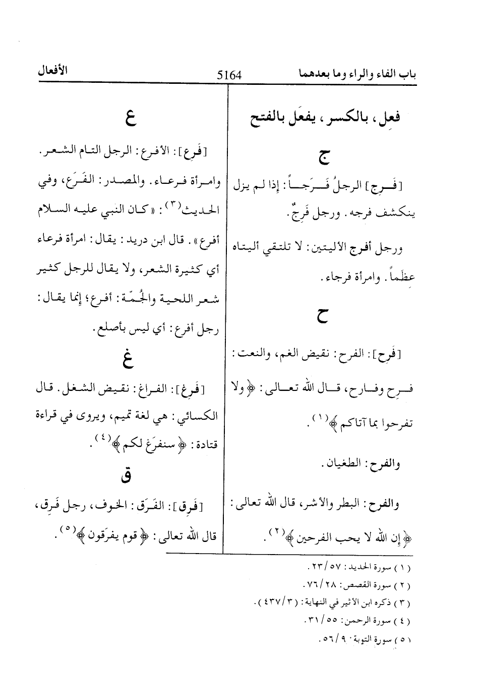 [فَرِغ]: الفراغ: نقيض الشغل. قال الكسائي: هي لغة تميم، ويروى في قراءة قتادة: سَنَفْرَغُ لَكُمْ «4».