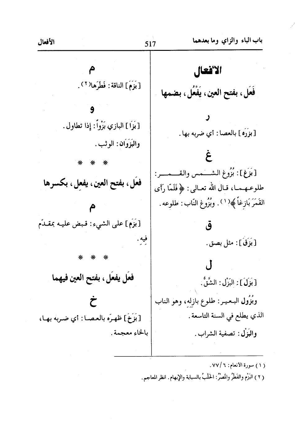 طلوعهما، قال اللّاه تعالى: فَلَمّاا رَأَى الْقَمَرَ باازِغاً «1». وبُزُوغ النّاب: طلوعه.