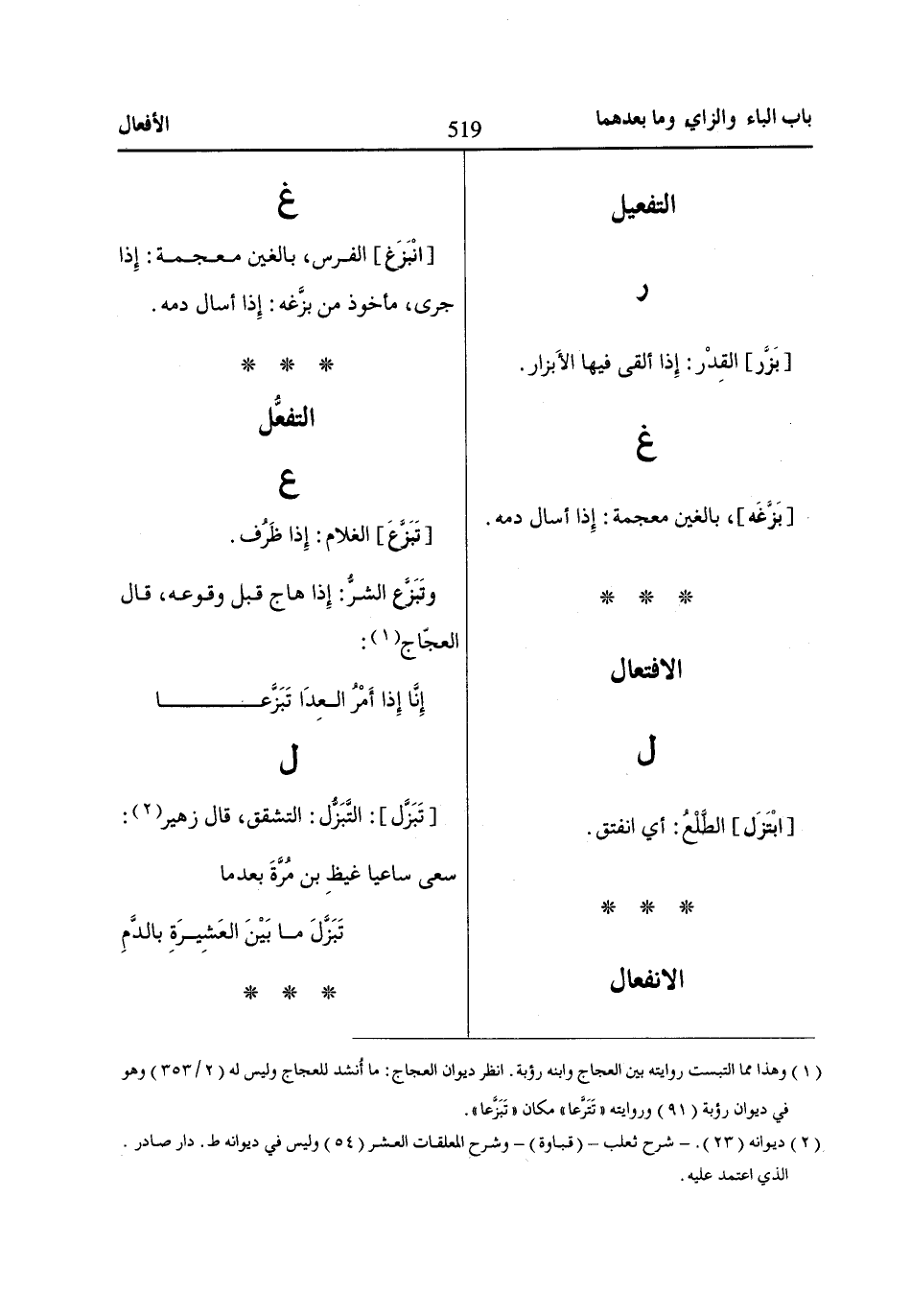(1) وهذا مما التبست روايته بين العجاج وابنه رؤبة. انظر ديوان العجاج: ما أُنشد للعجاج وليس له (2/ 353) وهو في ديوان رؤبة (91) وروايته «تَتَرَّعا» مكان «تَبَزَّعا».