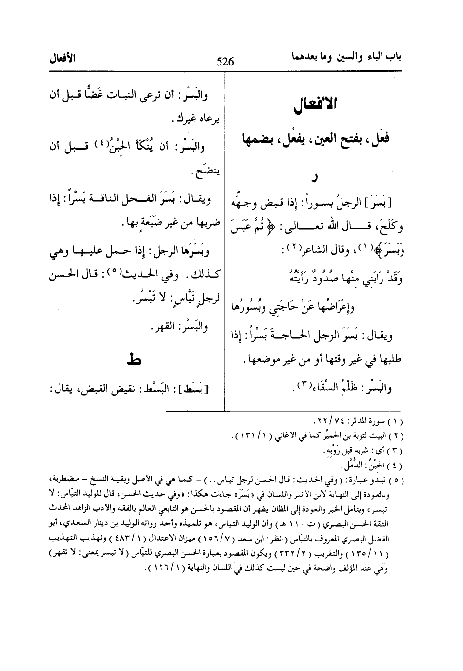 (5) تبدو عبارة: (وفي الحديث: قال الحسن لرجل تياس .. ) - كما هي في الأصل وبقية النسخ- مضطربة، وبالعودة إِلى النهاية لابن الأثير واللسان في «بَسَرَ» جاءت هكذا: «وفي حديث الحسن، قال للوليد التيّاس: لا تبسر» وبتأمل الخبر والعودة إِلى المظان يظهر أن المقصود بالحسن هو التابعي العالم بالفقه والأدب الزاهد المحدث الثقة الحسن البصري (ت 110 هـ) وأن الوليد التياس، هو تلميذه وأحد رواته الوليد بن دينار السعدي، أبو الفضل البصري المعروف بالتيّاس (انظر: ابن سعد (7/ 156) ميزان الاعتدال (1/ 483) وتهذيب التهذيب (11/ 135) والتقريب (2/ 332) ويكون المقصود بعبارة الحسن البصري للتيّاس (لا تبسر بمعنى: لا تقهر) وهي عند المؤلف واضحة في حين ليست كذلك في اللسان والنهاية (1/ 126).