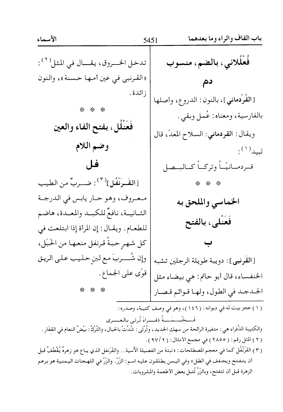 [القَرَنْفُل] «3»: ضربٌ من الطيب معروف، وهو حار يابس في الدرجة الثانية، نافعٌ للكبد والمعدة، هاضم للطعام. ويقال: إن المرأة إذا ابتلعت في كل شهرٍ حبةً قرنفل منعها من الحَبَل، وإن شُربَ مع لبنٍ حليب على الريق قوّى على الجماع.