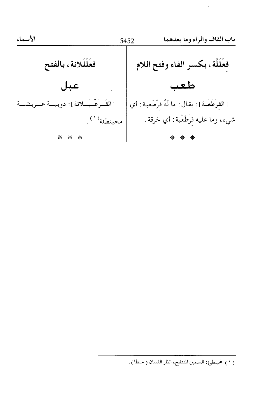 [القِرْطَعْبة]: يقال: ما لَهُ قِرْطَعبة: أي شيء، وما عليه قِرْطَعْبة: أي خرقة.
