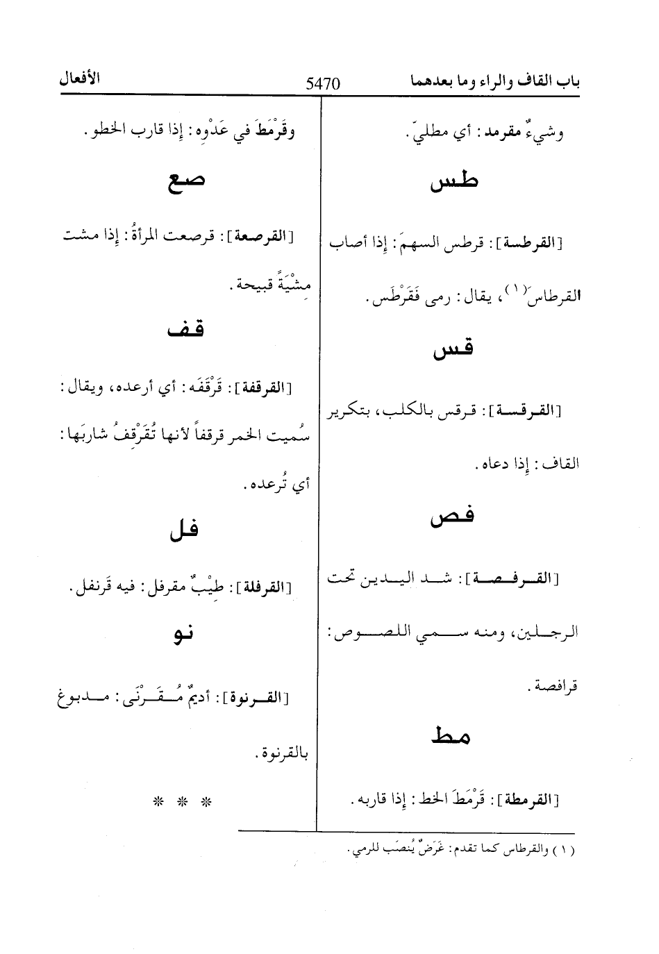 [القرطسة]: قرطس السهمَ: إذا أصاب القرطاسَ «1»، يقال: رمى فَقَرْطَس.