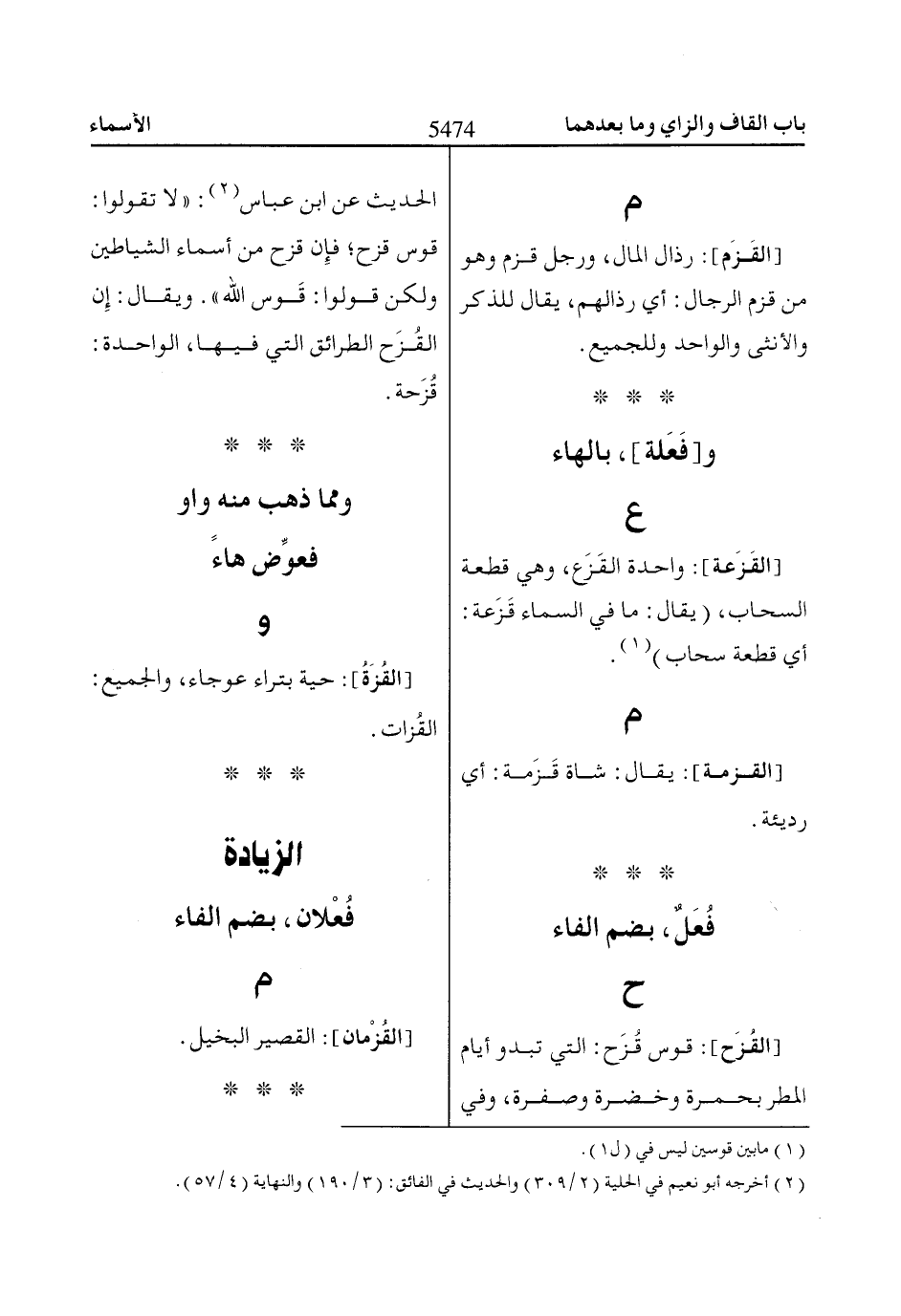 و [القُزَةُ]: حية بتراء عوجاء، والجميع: