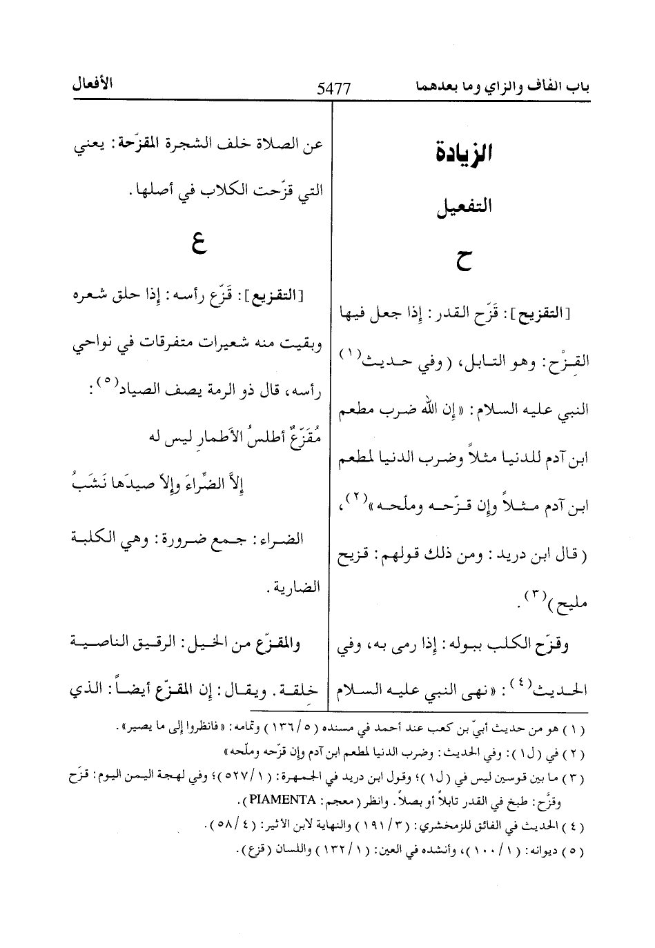 [التقزيع]: قَزّع رأسه: إذا حلق شعره وبقيت منه شعيرات متفرقات في نواحي رأسه، قال ذو الرمة يصف الصياد «5»: