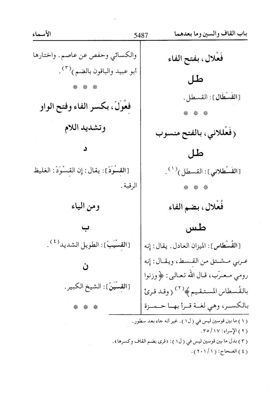 [القُسْطاس]: الميزان العادل. يقال: إنه عربي مشتق من القِسط، ويقال: إنه رومي معرّب، قال اللّاه تعالى: وَزِنُوا بِالْقِسْطااسِ الْمُسْتَقِيمِ* «2» (وقد قرئ بالكسر، وهي لغة قرأ بها حمزة والكسائي وحفص عن عاصم. واختارها أبو عبيد والباقون بالضم) «3».