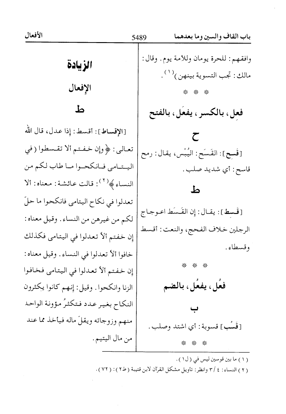 [الإقساط]: أقسط: إذا عدل، قال اللّاه تعالى: وَإِنْ خِفْتُمْ أَلّاا تُقْسِطُوا (فِي الْيَتاامى فَانْكِحُوا ماا طاابَ لَكُمْ مِنَ النِّسااءِ «2»: