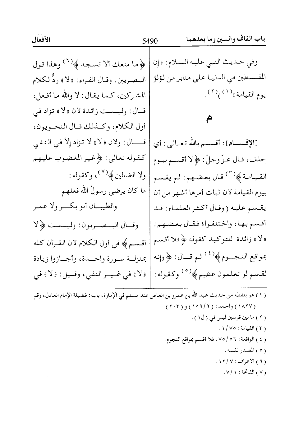 وقال البصريون: وليست لاا أُقْسِمُ في أول الكلام لأن القرآن كله بمنزلة سورة واحدة، وأجازوا زيادة «لا» في غير النفي، وقيل: «لا» في
