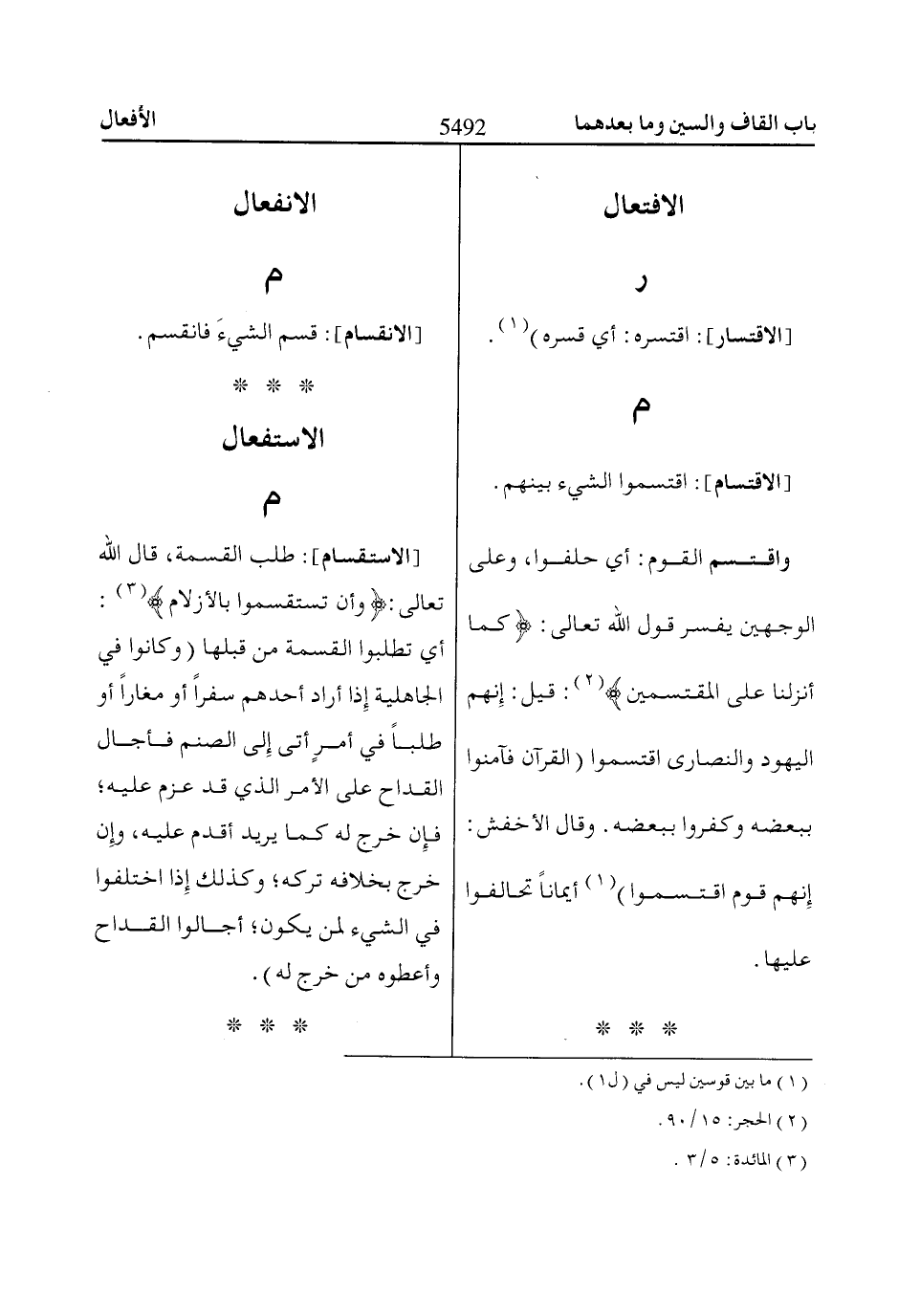 واقتسم القوم: أي حلفوا، وعلى الوجهين يفسر قول اللّاه تعالى: كَماا أَنْزَلْناا عَلَى الْمُقْتَسِمِينَ «2»: