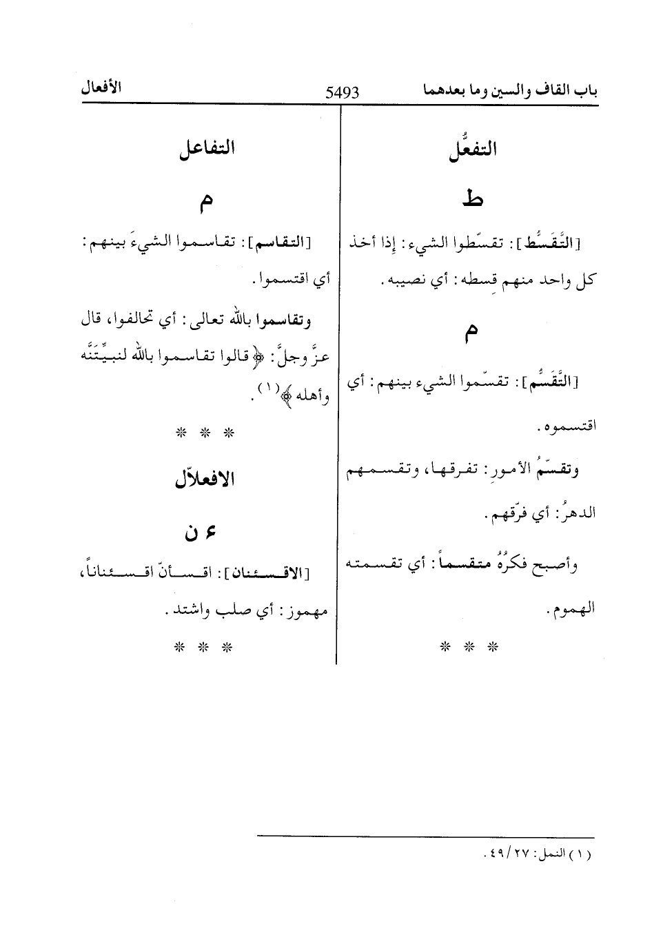 وتقاسموا باللّاه تعالى: أي تحالفوا، قال عزَّ وجلَّ: قاالُوا تَقااسَمُوا بِاللّاهِ لَنُبَيِّتَنَّهُ وَأَهْلَهُ «1».