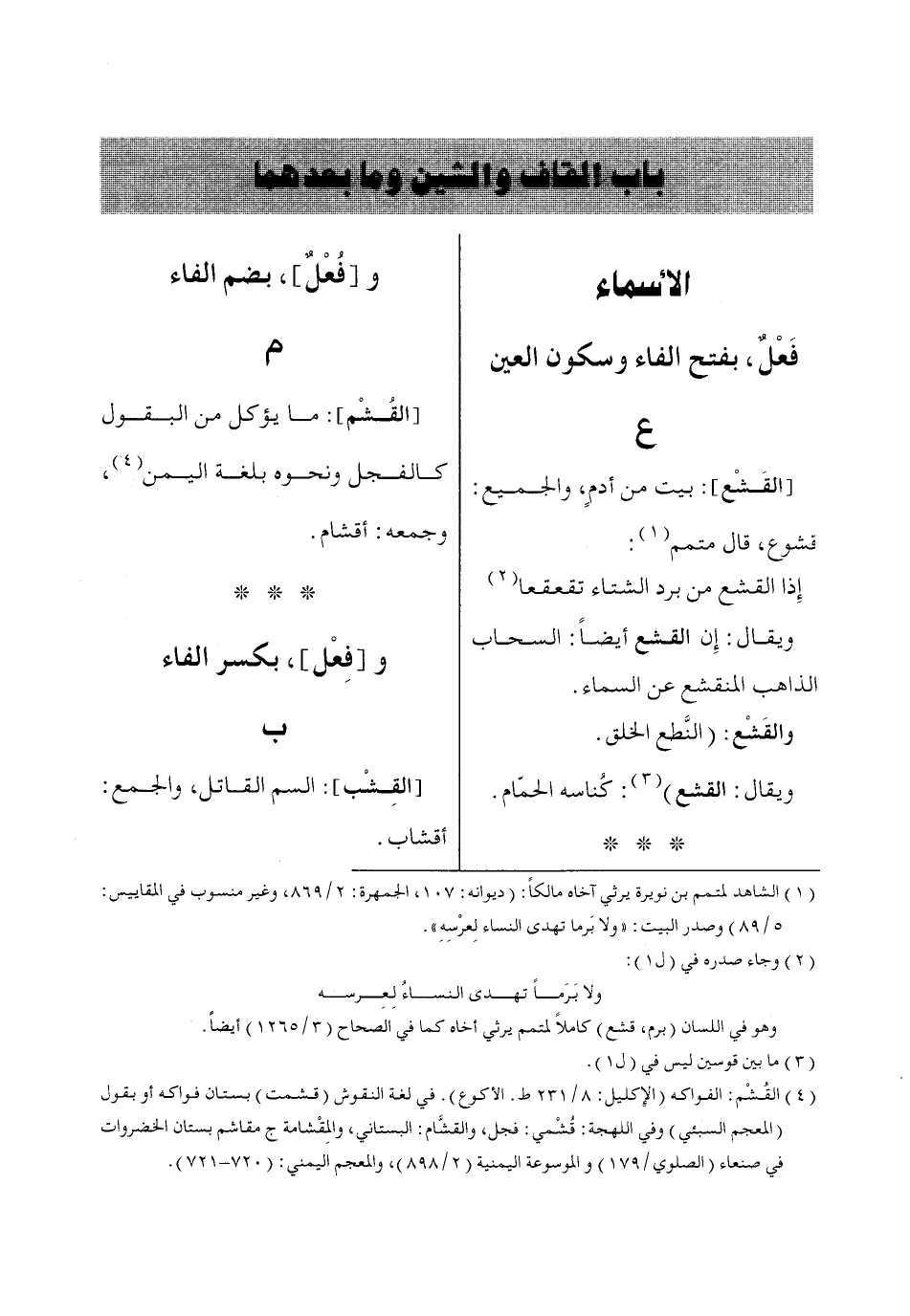 (4) القُشْم: الفواكه (الإكليل: 8/ 231 ط. الأكوع). في لغة النقوش (قشمت) بستان فواكه أو بقول (المعجم السبئي) وفي اللهجة: قُشْمي: فجل، والقشَّام: البستاني، والمِقْشامة ج مقاشم بستان الخضروات في صنعاء (الصلوي/ 179) والموسوعة اليمنية (2/ 898)، والمعجم اليمني: (720 - 721).