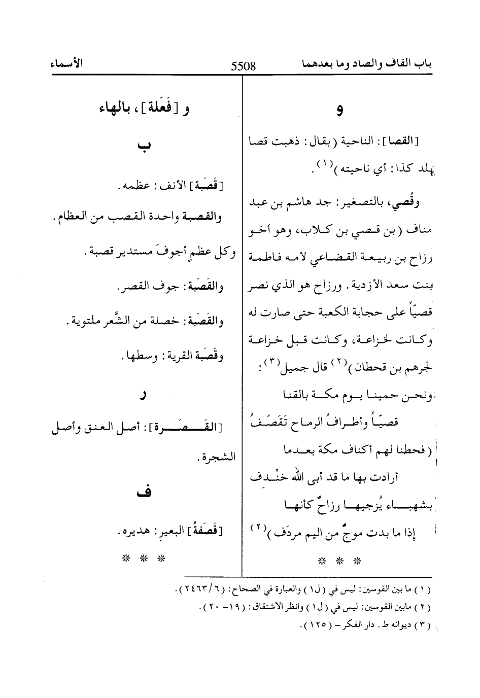 وقُصي، بالتصغير: جد هاشم بن عبد مناف (بن قصي بن كلاب، وهو أخو رزاح بن ربيعة القضاعي لأمه فاطمة بنت سعد الأزدية. ورزاح هو الذي نصر قصيّا على حجابة الكعبة حتى صارت له وكانت لخزاعة، وكانت قبل خزاعة لجرهم بن قحطان) «2» قال جميل «3»: