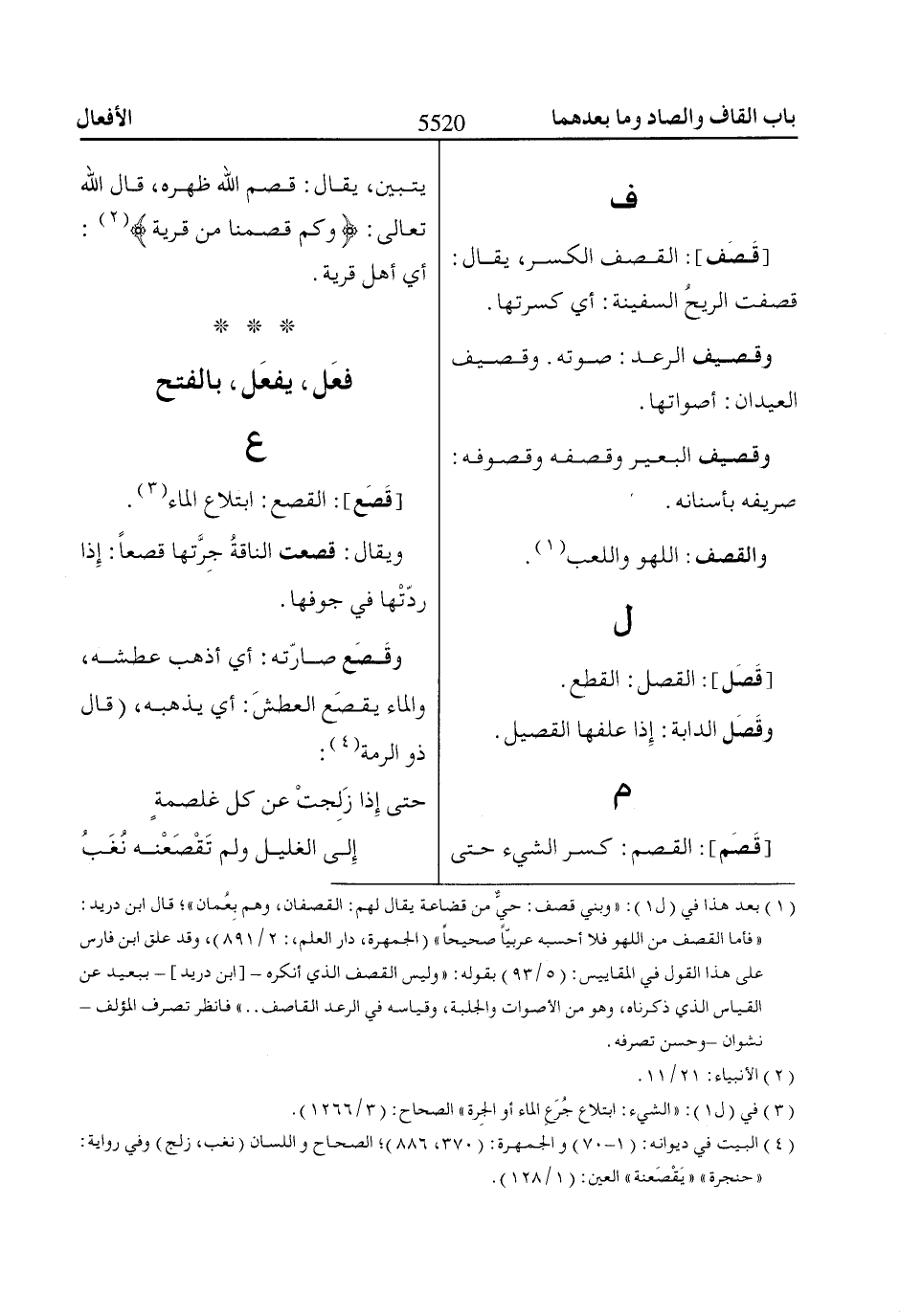 (1) بعد هذا في (ل 1): «وبني قصف: حيٌّ من قضاعة يقال لهم: القصفان، وهم بِعُمان»؛ قال ابن دريد: