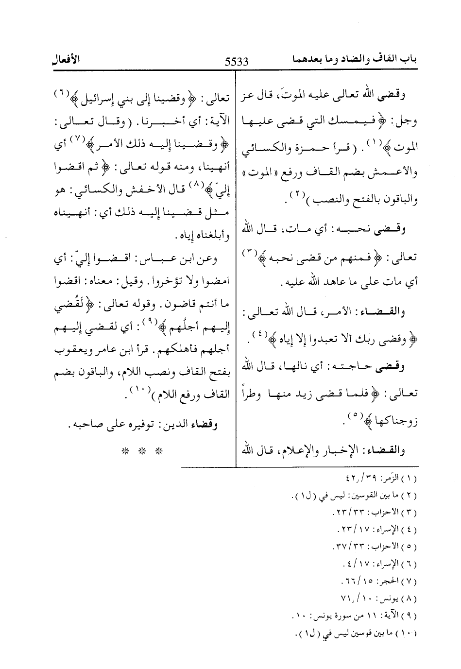 وقضى اللّاه تعالى عليه الموتَ، قال عز وجل: فَيُمْسِكُ الَّتِي قَضى عَلَيْهَا الْمَوْتَ «1». (قرأ حمزة والكسائي والأعمش بضم القاف ورفع «الموتُ» والباقون بالفتح والنصب) «2».