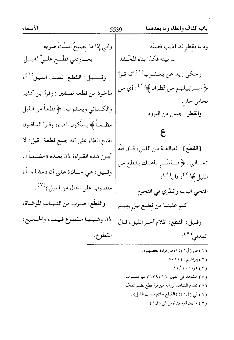 [القِطْع]: الطائفة من الليل، قال اللّاه تعالى: فَأَسْرِ بِأَهْلِكَ بِقِطْعٍ مِنَ اللَّيْلِ* «3»، قال «4»: