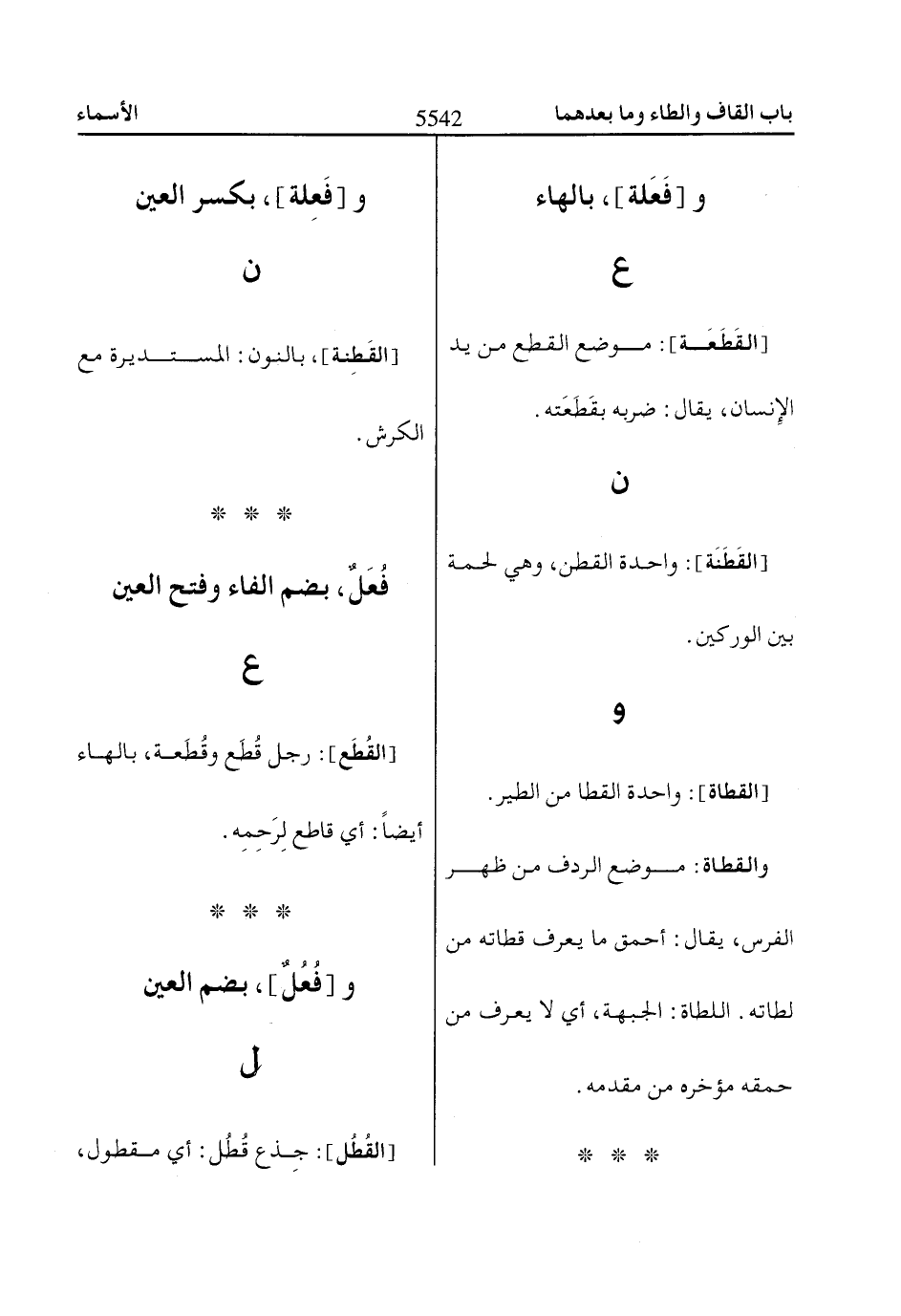 [القَطَعَة]: موضع القطع من يد الإنسان، يقال: ضربه بقَطَعَته.