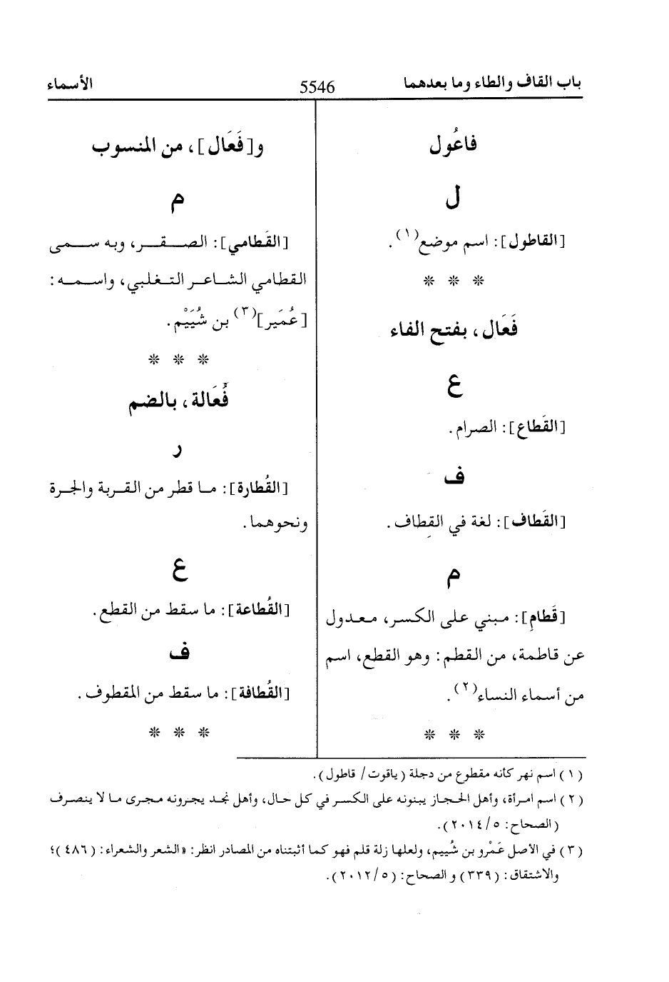 [قَطامِ]: مبني على الكسر، معدول عن قاطمة، من القطم: وهو القطع، اسم من أسماء النساء «2».