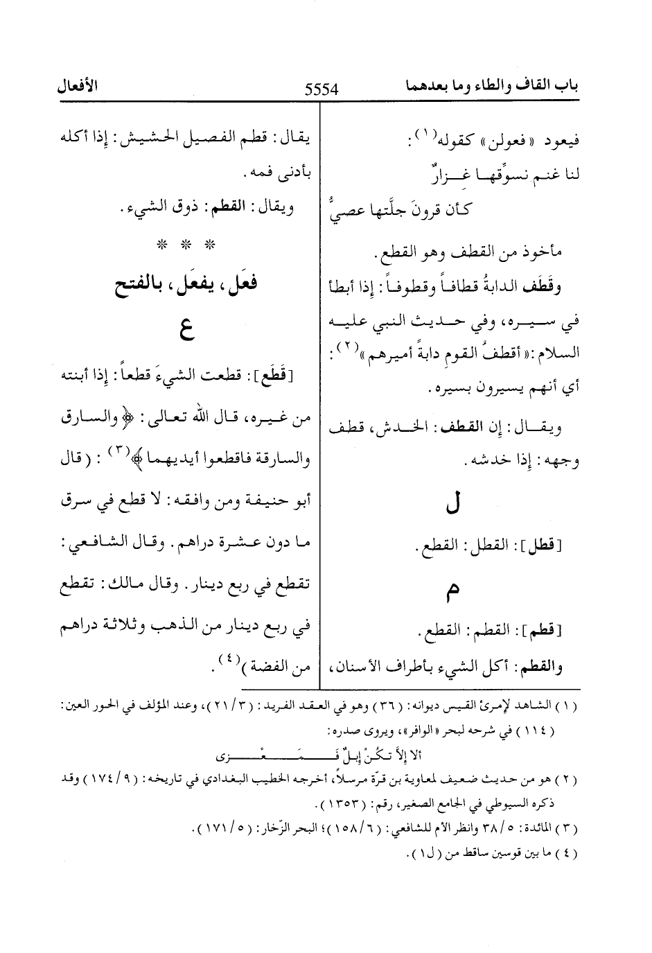 [قَطَع]: قطعت الشيءَ قطعا: إذا أبنته من غيره، قال اللّاه تعالى: وَالسّاارِقُ وَالسّاارِقَةُ فَاقْطَعُوا أَيْدِيَهُماا «3»: (قال أبو حنيفة ومن وافقه: لا قطع في سرق ما دون عشرة دراهم. وقال الشافعي: