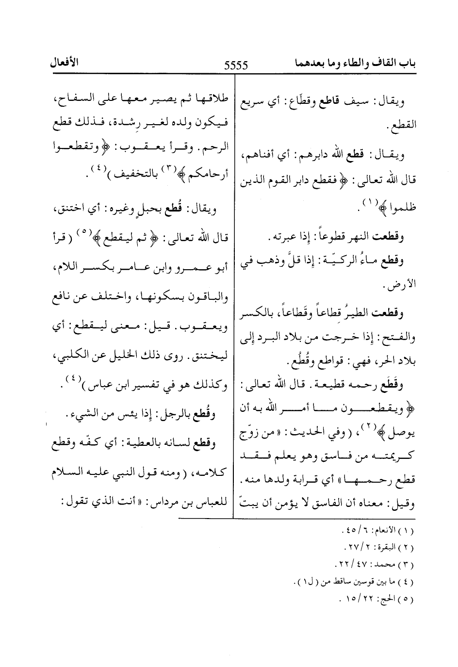 ويقال: قُطع بحبلٍ وغيره: أي اختنق، قال اللّاه تعالى: ثُمَّ لْيَقْطَعْ «5» (قرأ أبو عمرو وابن عامر بكسر اللام، والباقون بسكونها، واختلف عن نافع ويعقوب.
