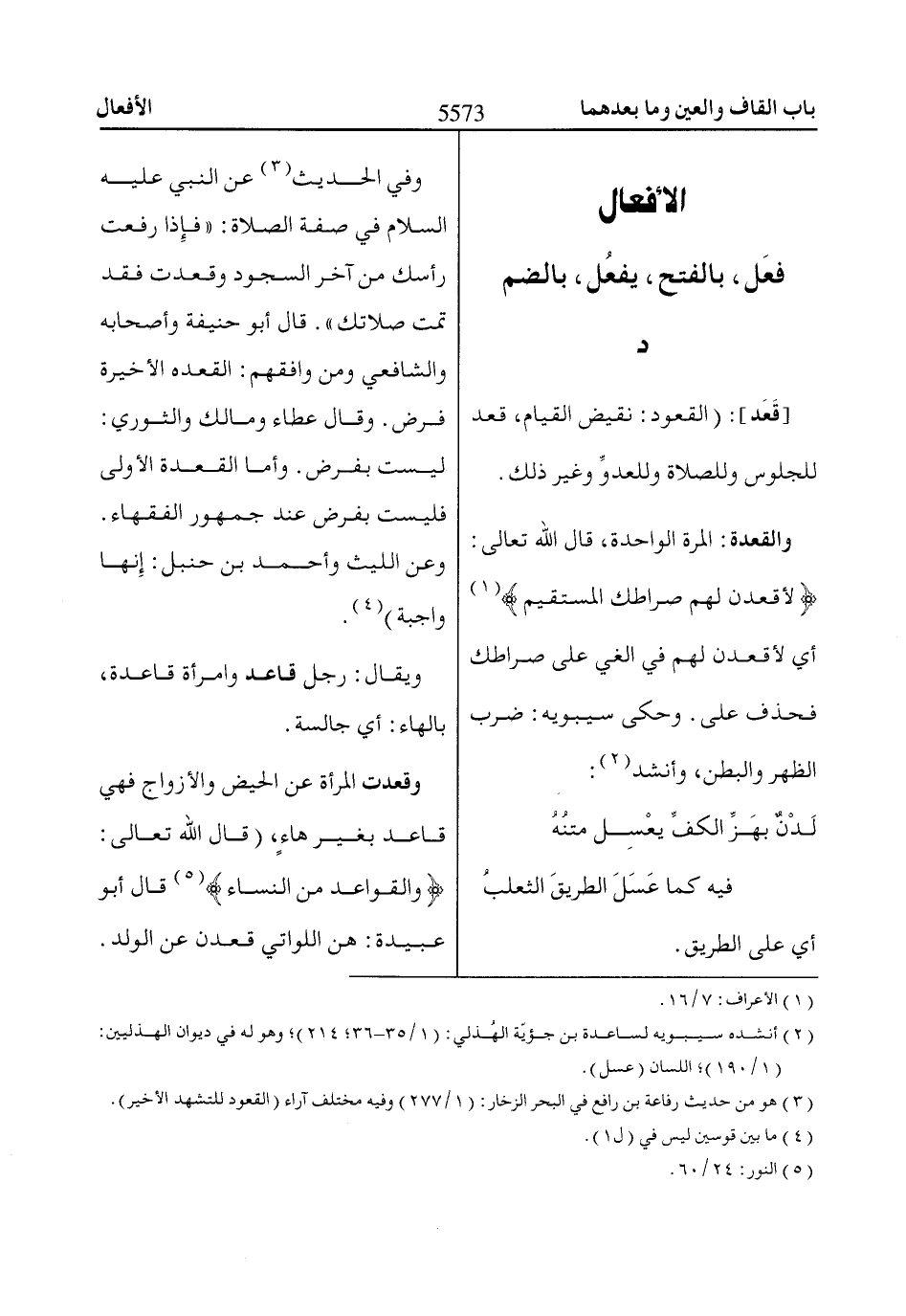 [قَعَد]: (القعود: نقيض القيام، قعد للجلوس وللصلاة وللعدوِّ وغير ذلك.