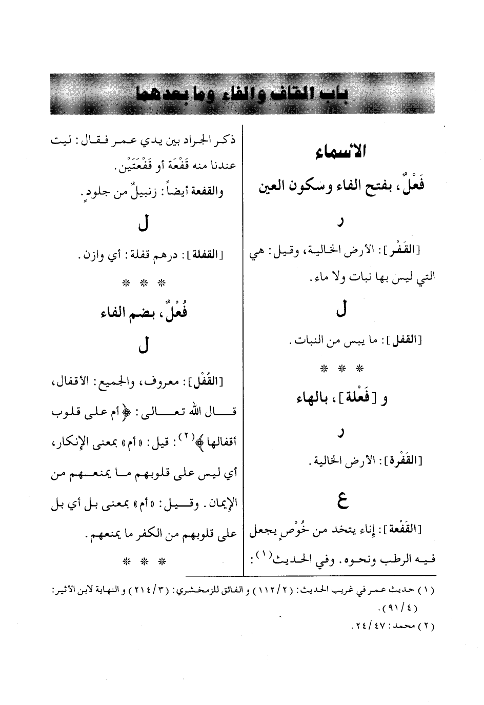 [القُفْل]: معروف، والجميع: الأقفال، قال اللّاه تعالى: أَمْ عَلى قُلُوبٍ أَقْفاالُهاا «2»: قيل: «أَمْ» بمعنى الإنكار، أي ليس على قلوبهم ما يمنعهم من الإيمان. وقيل: «أَمْ» بمعنى بل أي بل على قلوبهم من الكفر ما يمنعهم.