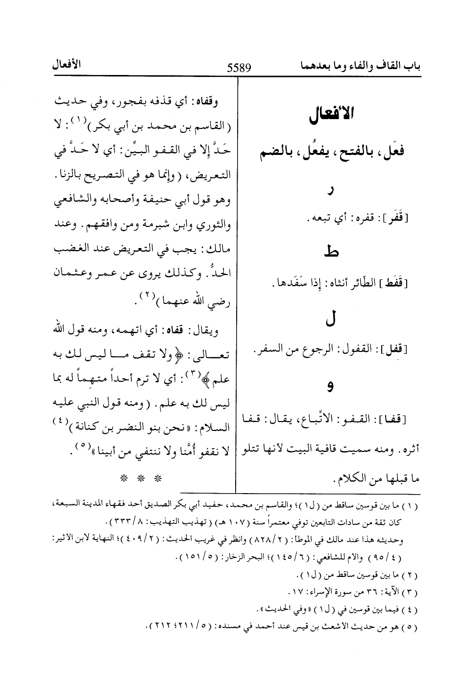 ويقال: قفاه: أي اتهمه، ومنه قول اللّاه تعالى: وَلاا تَقْفُ ماا لَيْسَ لَكَ بِهِ عِلْمٌ «3»: أي لا ترم أحدا متهِما له بما ليس لك به علم. (ومنه
