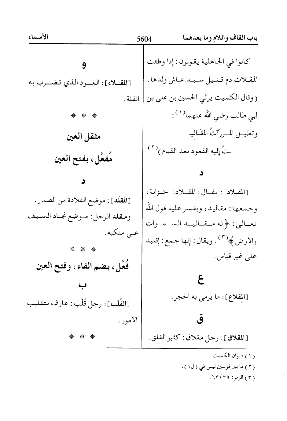 [المِقلاد]: يقال: المقلاد: الخزانة، وجمعها: مقاليد، ويفسر عليه قول اللّاه تعالى: لَهُ مَقاالِيدُ السَّمااوااتِ وَالْأَرْضِ* «3». ويقال: إنها جمع: إقليد على غير قياس.