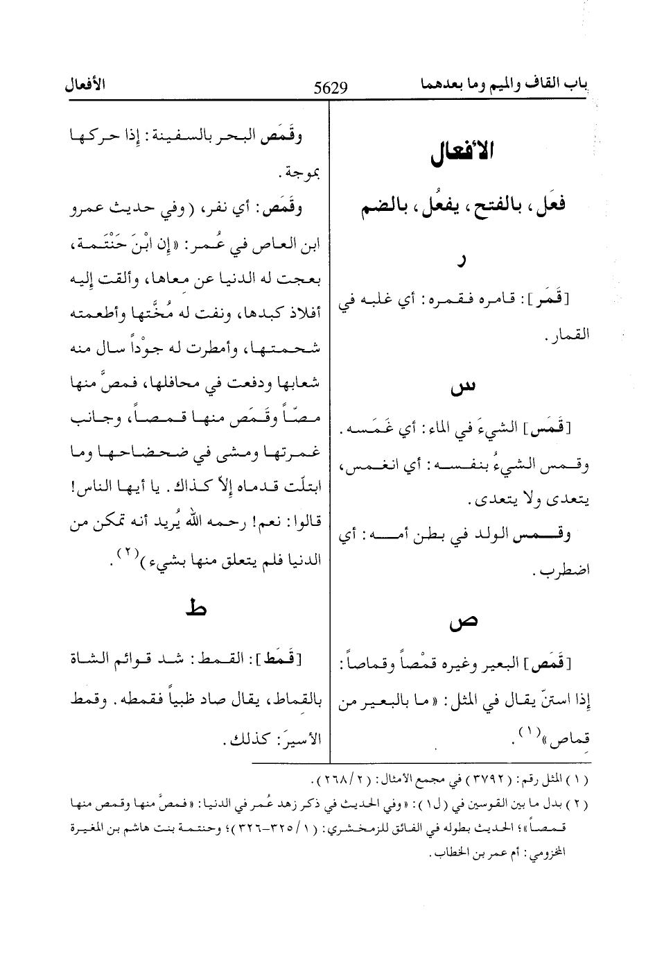 (2) بدل ما بين القوسين في (ل 1): «وفي الحديث في ذكر زهد عُمر في الدنيا: «فمصَّ منها وقمص منها قمصا»؛ الحديث بطوله في الفائق للزمخشري: (1/ 325 - 326)؛ وحنتمة بنت هاشم بن المغيرة المخزومي: أم عمر بن الخطاب.