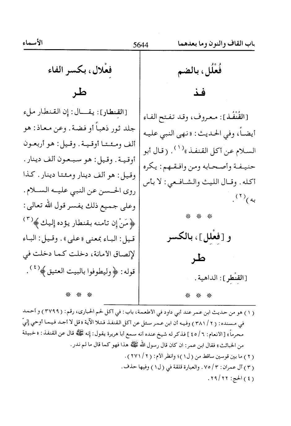 (1) هو من حديث ابن عمر عند أبي داود في الأطعمة، باب: في أكل لحم الحبارى، رقم: (3799) وأحمد في مسنده: (2/ 381) وفيه أن ابن عمر سئل عن أكل القنفذ فتلا الآية «قُلْ لاا أَجِدُ فِي ماا أُوحِيَ إِلَيَّ مُحَرَّماً» [الأنعام: 6/ 45] فذكر له شيخ عنده أنه سمع أبا هريرة يقول: إنه صلى اللّاه عليه وسلم قال عن القنفذ: «خبيثة من الخبائث» فقال ابن عمر: ان كان قال رسول اللّاه صلى اللّاه عليه وسلم هذا فهو كما قال ما لم ندر.
