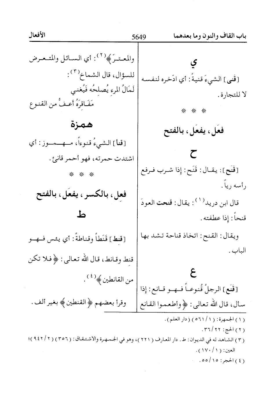 [قَنَع] الرجلُ قُنوعا فهو قانع: إذا سأل، قال اللّاه تعالى: وَأَطْعِمُوا الْقاانِعَ وَالْمُعْتَرَّ «2»: أي السائل والمتعرض للسؤال، قال الشماخ «3»: