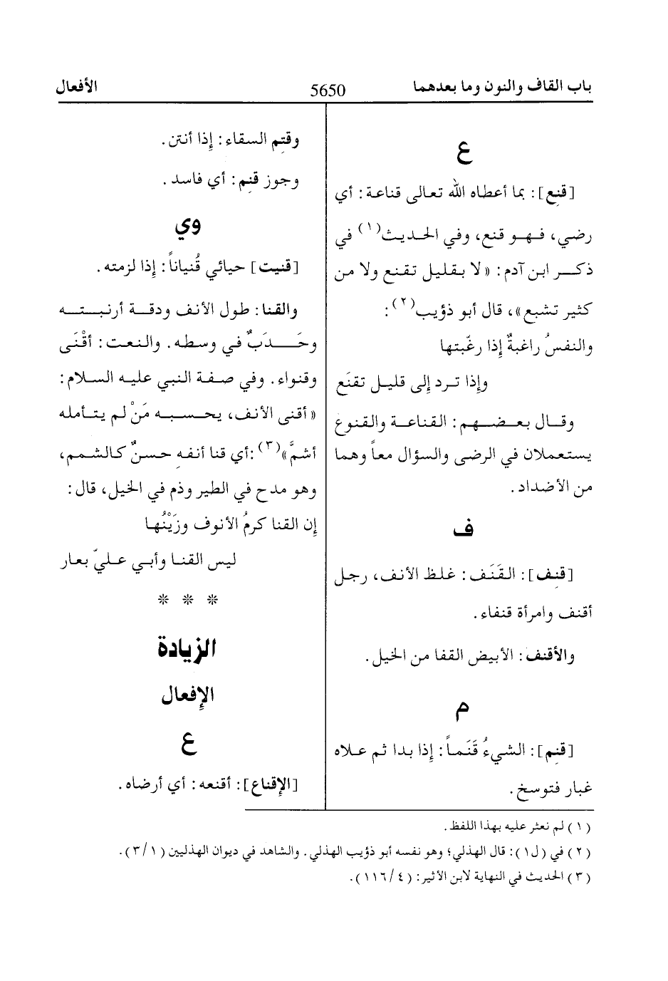 [قنِف]: القَنَف: غلظ الأنف، رجل أقنف وامرأة قنفاء.