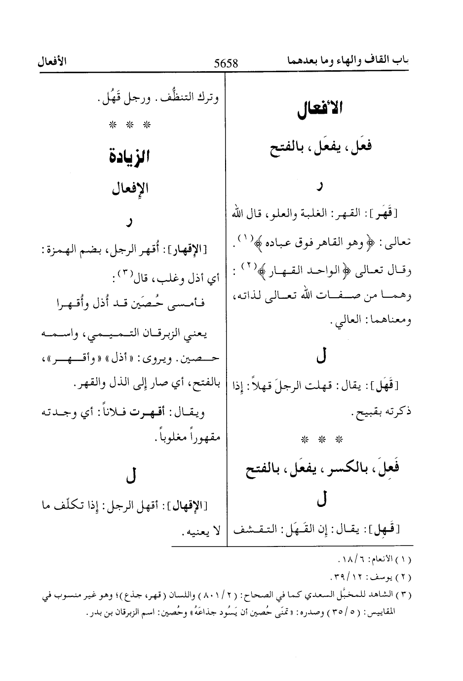 (3) الشاهد للمخبَّل السعدي كما في الصحاح: (2/ 801) واللسان (قهر، جذع)؛ وهو غير منسوب في المقاييس: (5/ 35) وصدره: