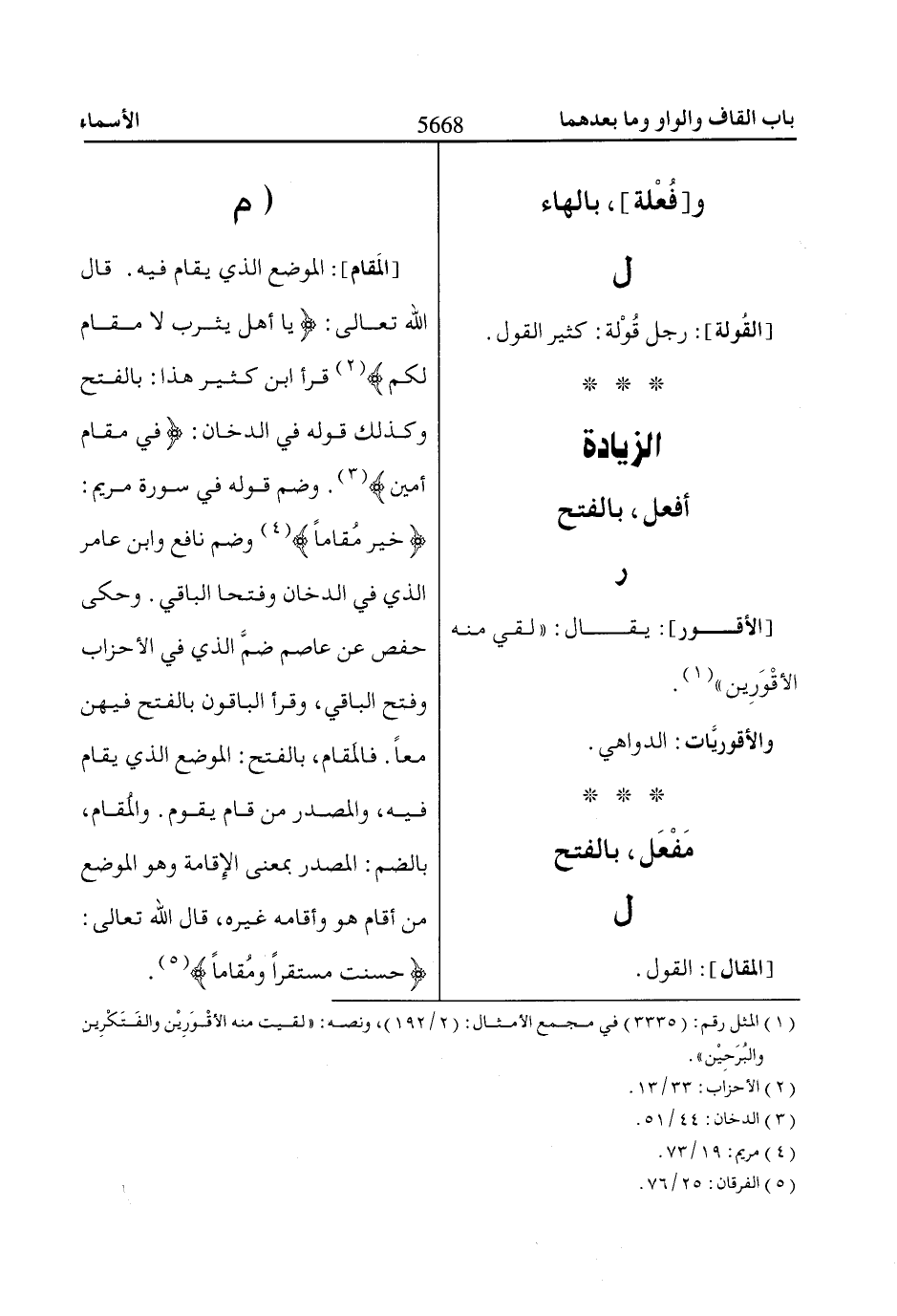 [المَقام]: الموضع الذي يقام فيه. قال اللّاه تعالى: ياا أَهْلَ يَثْرِبَ لاا مُقاامَ لَكُمْ «2» قرأ ابن كثير هذا: بالفتح وكذلك قوله في الدخان: فِي مَقاامٍ أَمِينٍ «3». وضم قوله في سورة مريم: