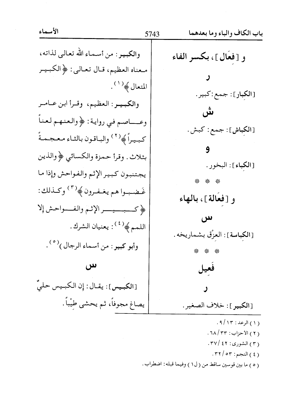 والكبير: العظيم، وقرأ ابن عامر وعاصم في رواية: وَالْعَنْهُمْ لَعْناً كَبِيراً «2» والباقون بالثاء معجمةً بثلاث. وقرأ حمزة والكسائي والذين يجتنبون كبير الإِثم وَالْفَوااحِشَ وَإِذاا ماا غَضِبُوا هُمْ يَغْفِرُونَ «3» وكذلك: