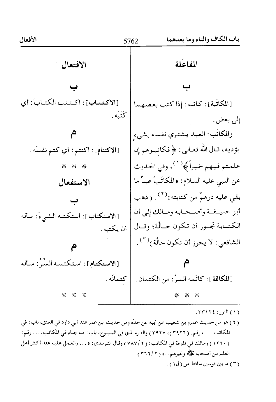 والمكاتَب: العبد يشتري نفسه بشيءٍ يؤديه، قال اللّاه تعالى: فَكااتِبُوهُمْ إِنْ عَلِمْتُمْ فِيهِمْ خَيْراً «1»،
