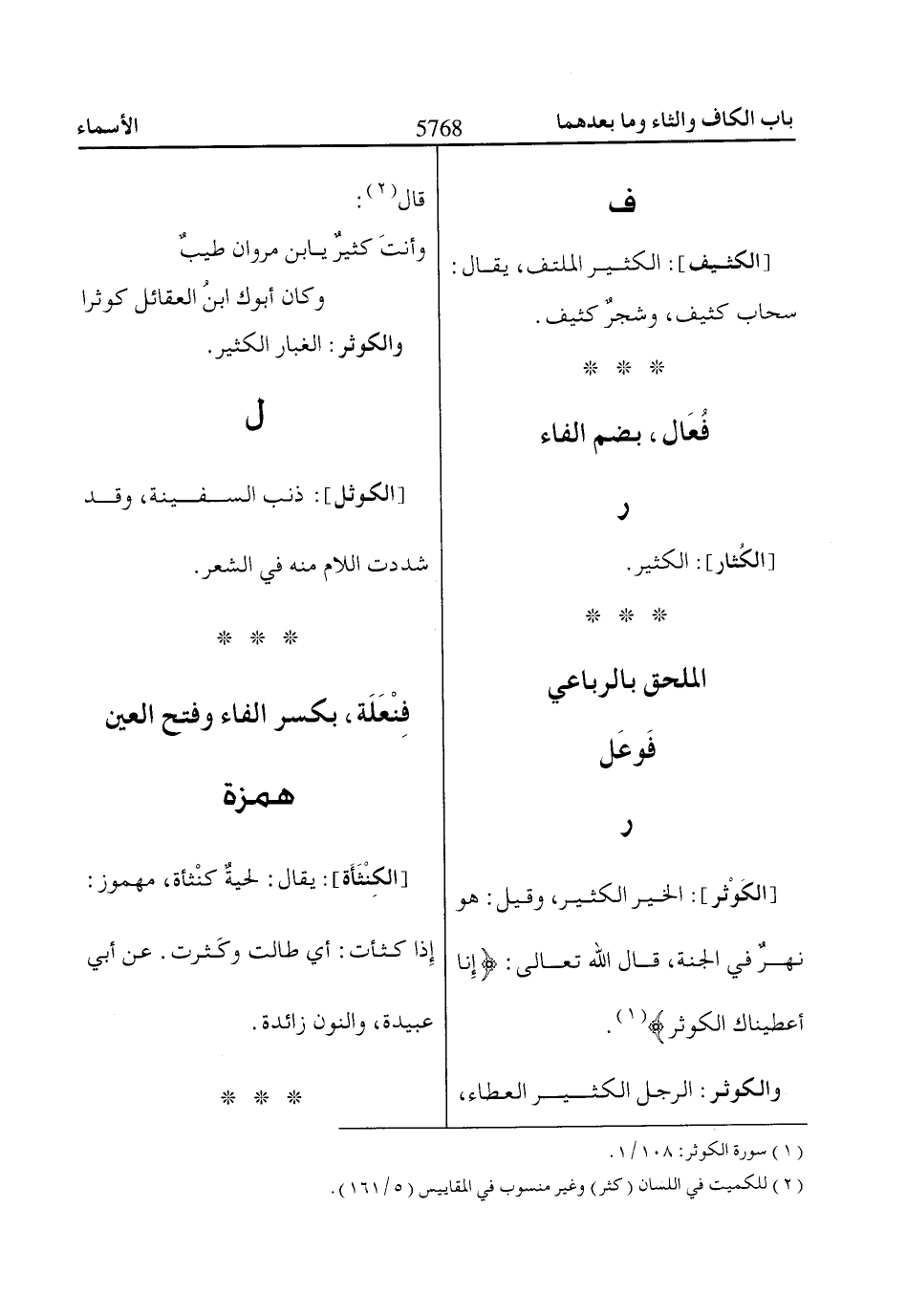 [الكَوْثر]: الخير الكثير، وقيل: هو نهرٌ في الجنة، قال اللّاه تعالى: إِنّاا أَعْطَيْنااكَ الْكَوْثَرَ «1».