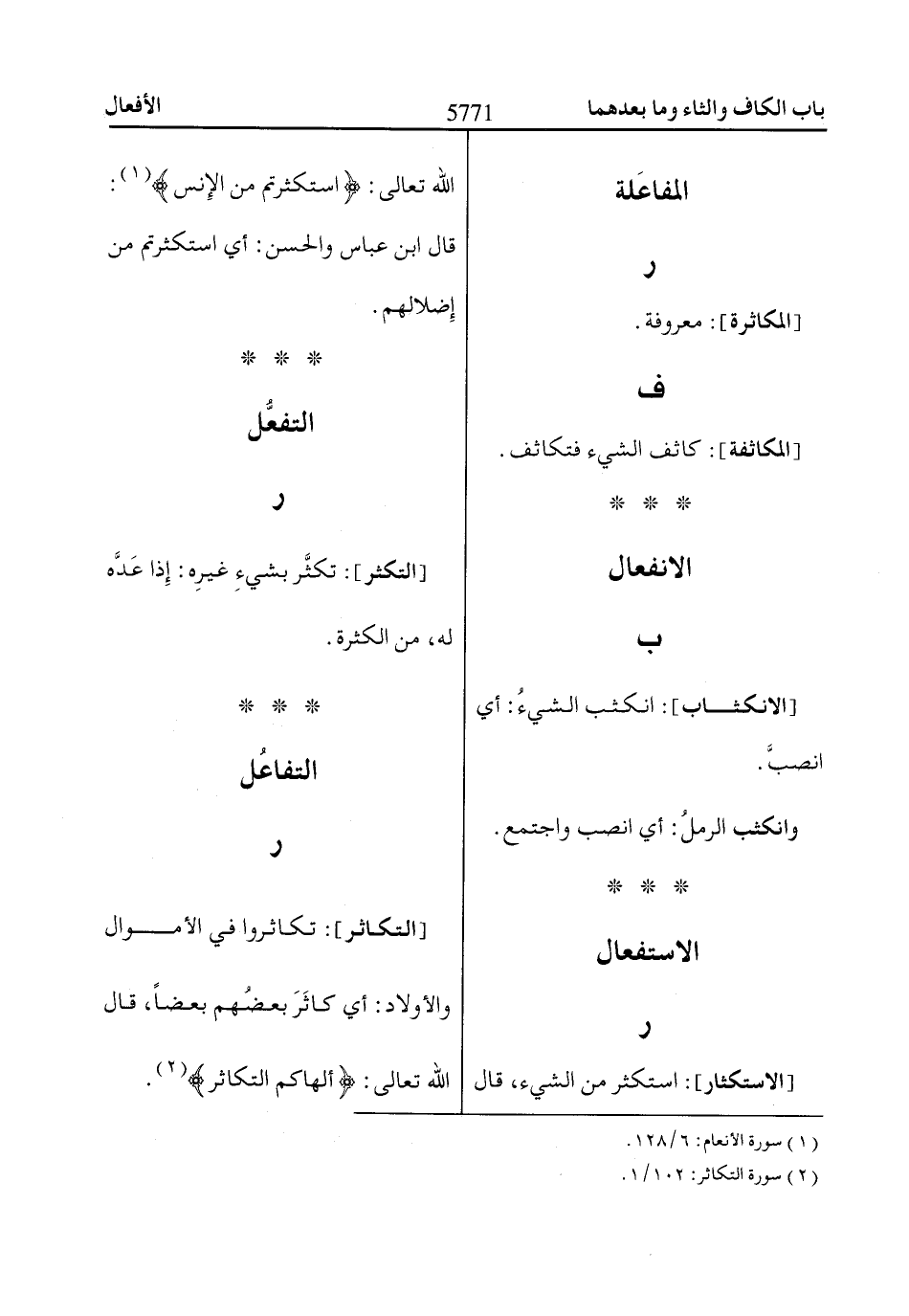 [التكاثر]: تكاثروا في الأموال والأولاد: أي كاثَرَ بعضُهم بعضاً، قال اللّاه تعالى: أَلْهااكُمُ التَّكااثُرُ «2».